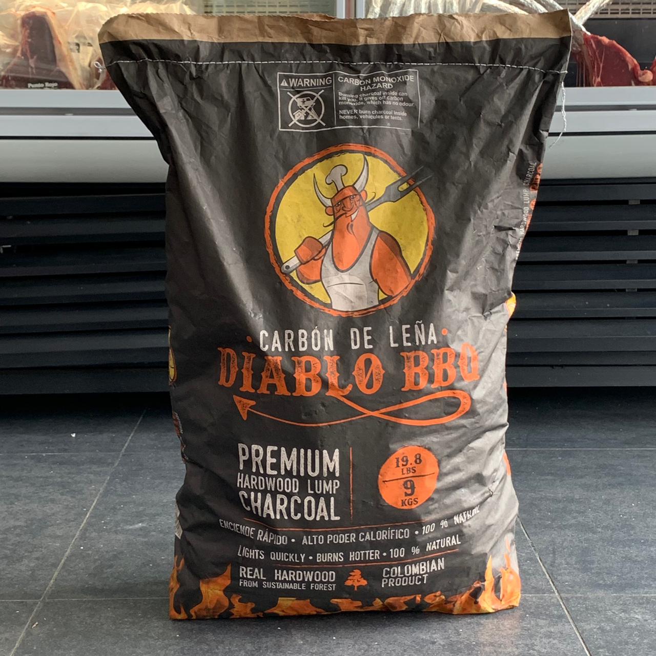 Carbón de leña premium de la marca DIABLO BBQ con alto poder calorífico, baja producción de cenizas, alto rendimiento y estable a altas temperaturas, delicioso aroma, no chispeante, 100 % natural sin aditivos.
